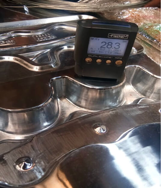 Kami melakukan proses hard-chrome coating dengan hasil pelapisan yang homogen dan bebasdari porositas (zero hole/poros). Hal ini dicapai dengan menggunakan larutan kromium berkualitas tinggi serta penerapan quality control yang ketat dalam setiap tahap produksi. Hard-chrome coating kami menciptakan permukaan yang licin dan halus, yang dapat dibuktikan secara visual, terasa saat diraba, serta terkonfirmasi melalui pengujian mikroskopik. Selain itu, die yang telah melalui proses coating di BST memiliki ketahanan gesek yang tinggi, sehingga mampu menjaga dimensi cetakan tetap stabil sepanjang penggunaan.